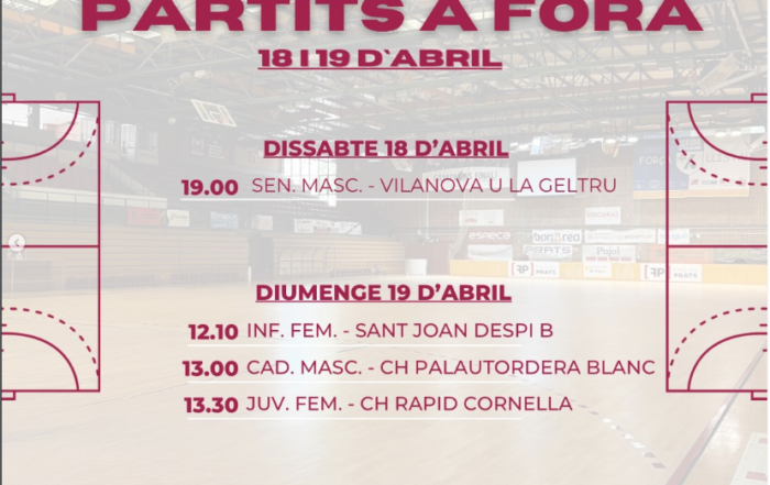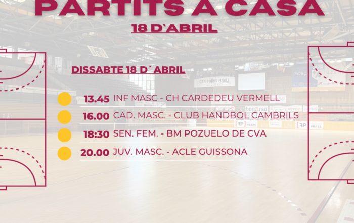 PROGRAMACIÓ DE PARTITS A CASA PER AQUEST CAP DE SETMANA.DISSABTE 18 d’ABRIL